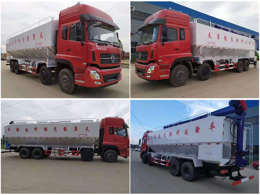 東風天龍前四后八44方電動散裝飼料車,雷諾350馬力發(fā)動機,法士特12檔變速箱,2050+4400+1350mm軸距,1100鋼絲胎,整車尺寸:12000×2500×3995mm