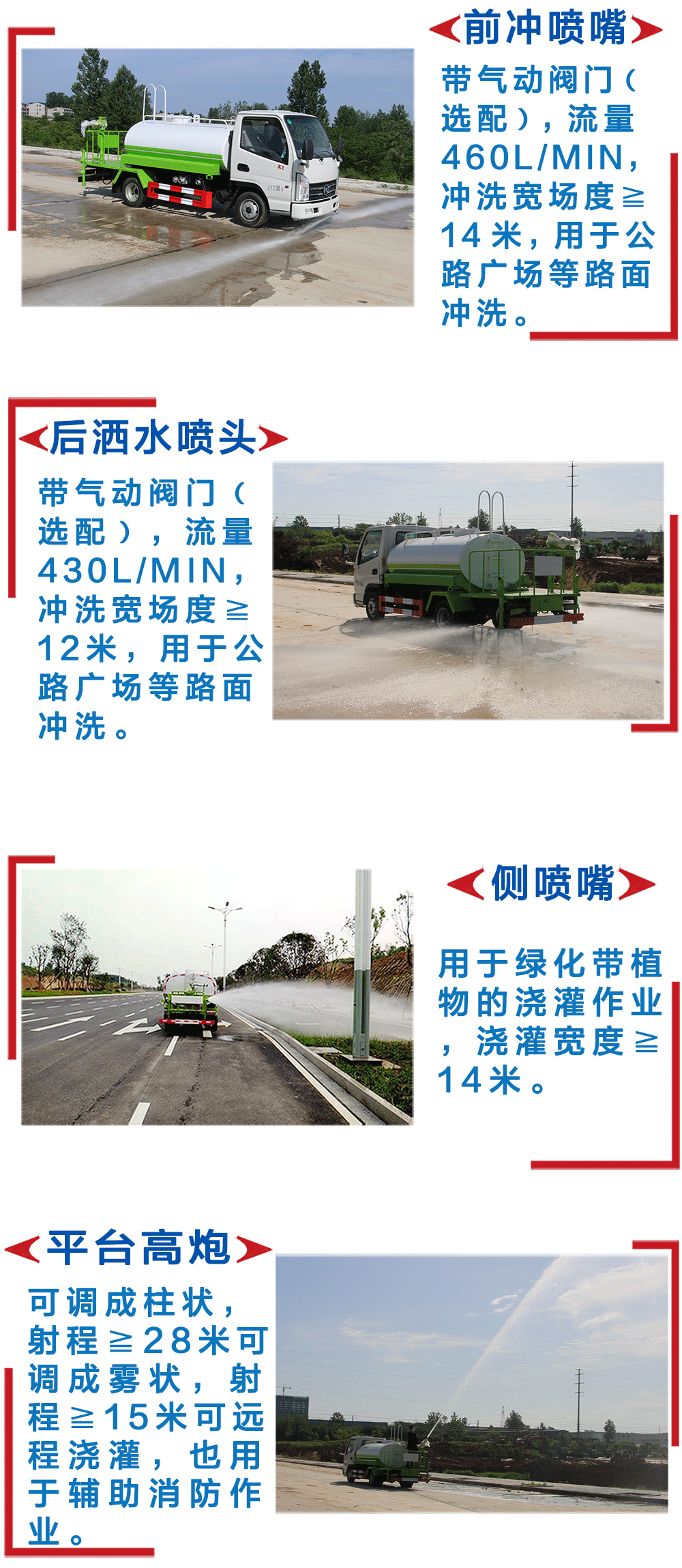 灑水車又稱為噴灑車、多功能灑水車、園林綠化灑水車、水罐車、運水車。 灑水車適合于各種路面沖洗,樹木、綠化帶、草坪綠化,道路、廠礦企業施工建設,高空建筑沖洗。具有灑水、壓塵、高、低位噴灑,農藥噴灑、護欄沖洗等功能,還具有運水、排水,應急等功能。