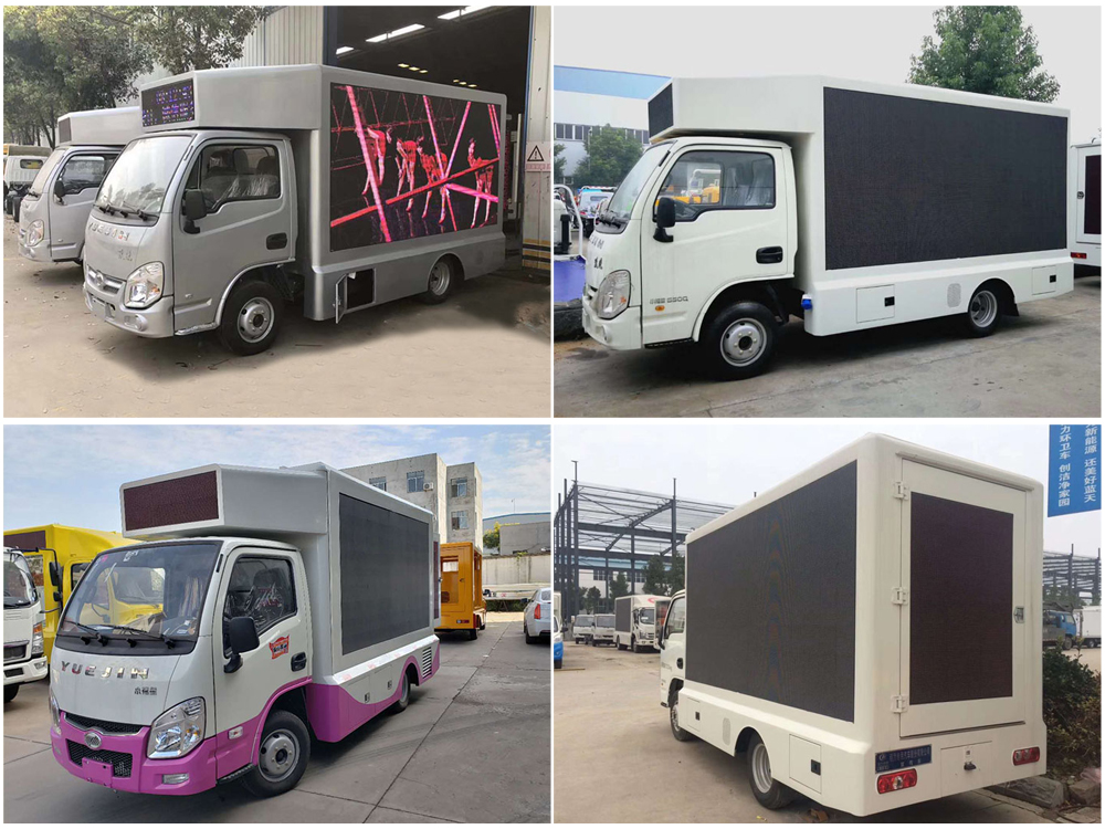 廣告車選裝配置:客戶可根據需求選裝屏幕清晰度(P10彩屏、P8彩屏、P6彩屏、P5彩屏、P4彩屏)、單面彩屏、雙面彩屏、雙面